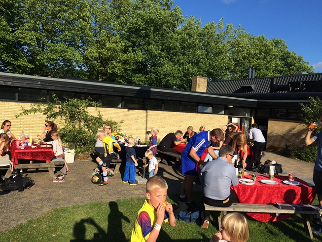 Da træningen var slut var der tændt op i grillen, buffeten var anrettet, og der var duge på bordene. Børn og forældre tog for sig, og snakken gik lystigt. Ungerne sad selvsagt ikke ned så længe ... der var jo bolde i nærheden!